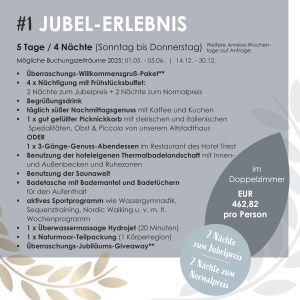 Und wie lässt sich ein Jubiläum besser feiern als gemeinsam? Wir haben deshalb exklusive Jubelangebote für Sie vorbereitet, um diesen besonderen Anlass mit Ihnen zu teilen und unvergessliche Momente zu schaffen. Feiern Sie mit uns.