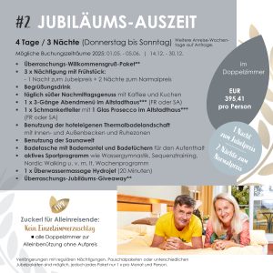 Und wie lässt sich ein Jubiläum besser feiern als gemeinsam? Wir haben deshalb exklusive Jubelangebote für Sie vorbereitet, um diesen besonderen Anlass mit Ihnen zu teilen und unvergessliche Momente zu schaffen. Feiern Sie mit uns.